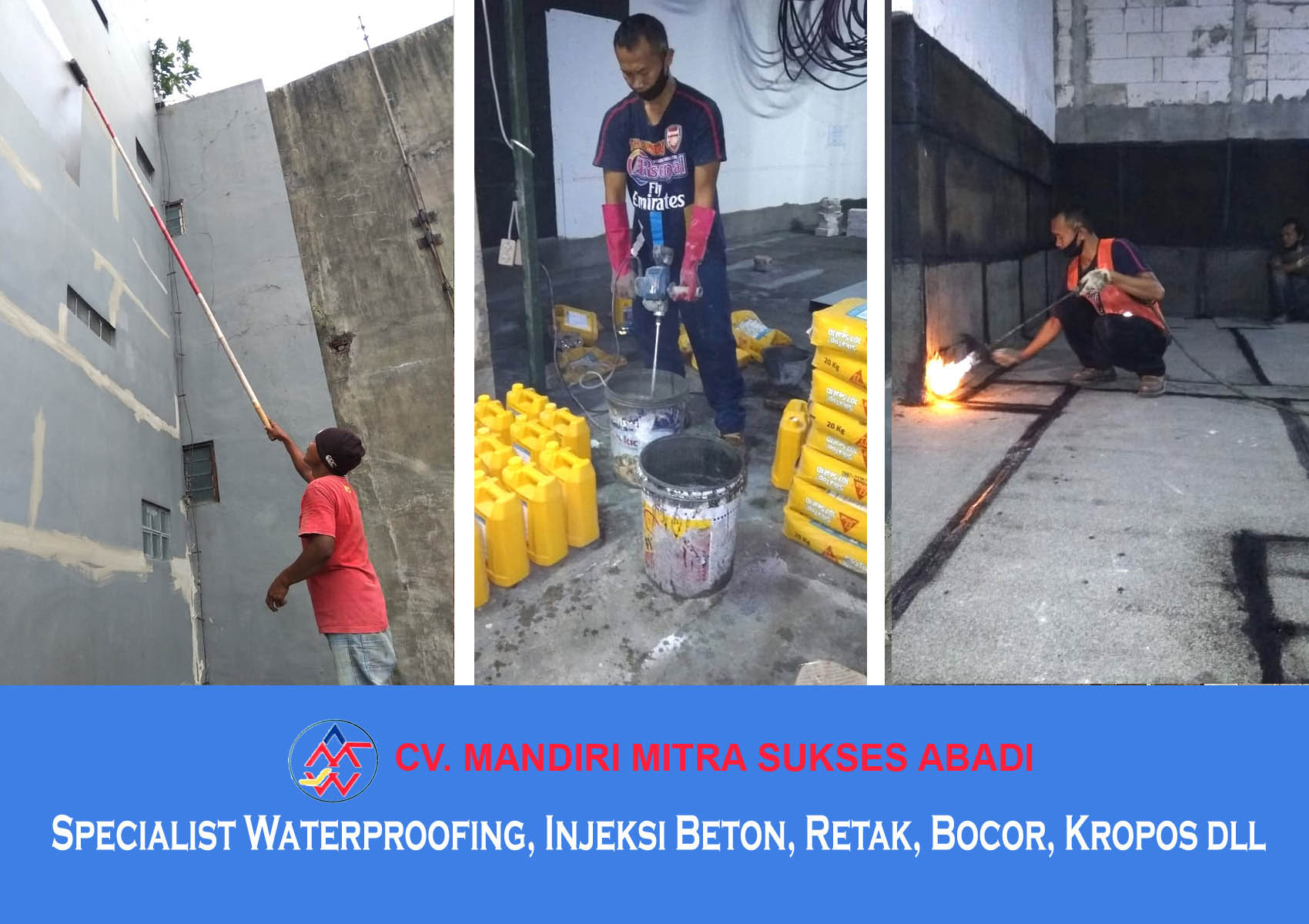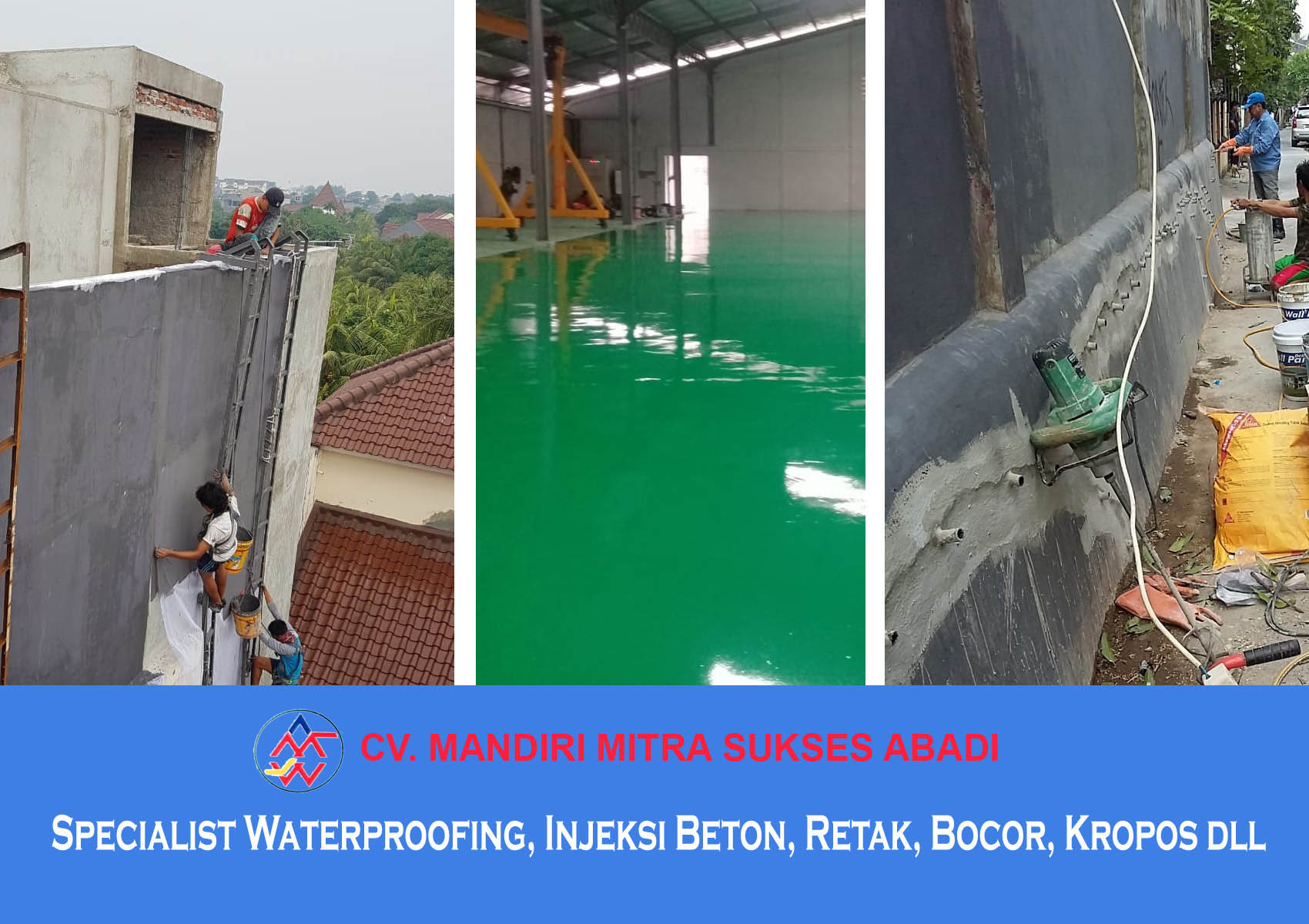 CV. MANDIRI MITRA SUKSES ABADI adalah perusahan yang bergerak dalam bidang specialist Contractor dan Waterproofing Yang sudah sangat berpengalaman dibidang aplikator waterproofing dan Injeksi Beton.